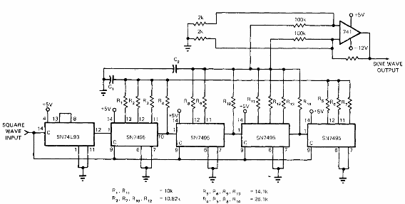 Esta configuración TTL convierte una señal cuadrática de entrada de frecuencia f en un signo senoidal de frecuencia 1/16 de f. El circuito fue obtenido en una documentación de 1972 haciendo uso de tecnología TTL. El circuito debe ser alimentado con 5 V y el operacional con fuente simétrica.