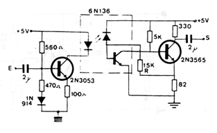 Este amplificador aislante que puede trabajar con señales de hasta 10 MHz se ha encontrado en una documentación francesa de los años 80. Los transistores admite equivalentes así como el acoplador. El circuito puede funcionar como shield.