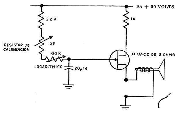 Esta configuración oscilador de audio con un transistor Unijuntura es de una documentación de 1958 pero se puede utilizar el 2N2646 y transistores más modernos. Los valores de los componentes se pueden aproximar a la norma actual. La frecuencia está dada por el capacitor.