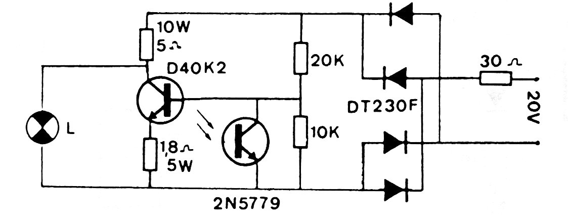 Este circuito para lámparas incandescentes de baja tensión utiliza transistor común y un foto-transistor que admite equivalente. Los diodos pueden ser los 1N4002. El circuito es de una documentación de los años 80.