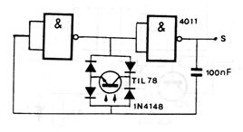 La frecuencia de este oscilador depende del capacitor y también de la intensidad de la luz que incide en el sensor. Las funciones NAND o NOR son del tipo CMOS y la alimentación debe quedar entre 3 y 12 V. Véase en el sitio los pines del integrado utilizado.