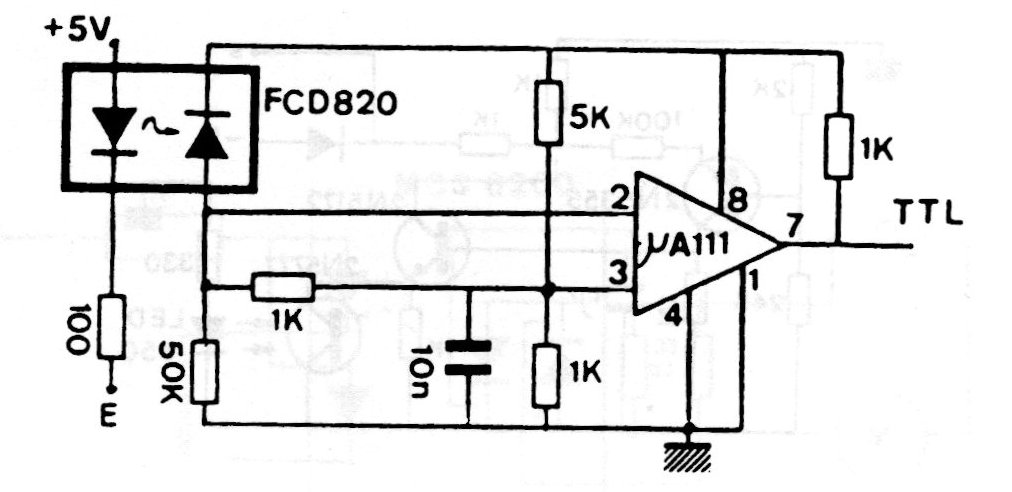 Este circuito amplifica señales TTL que se pueden utilizar en un sistema aislado para microcontroladores. Se pueden utilizar amplificadores operacionales equivalentes, y el resistor en serie con el emisor puede tener valores mayores en el caso de microcontroladores como el Arduino.