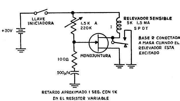 Este relé de retardo utiliza un transistor unijuntura para accionar directamente un relé sensible (1 mA). El circuito es de una publicación de 1958, pero se puede montar con un transistor 2N2646. Se puede utilizar un relé reed de acuerdo con el circuito. El tiempo depende básicamente del potenciómetro y del capacitor.