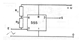 Utilizando un circuito integrado 555 este detector tiene el valor del umbral programado por los resistores R1 y R2. La alimentación se puede hacer con tensiones de 5 a 12 V y un posible uso es como shield de entrada para microcontroladores.