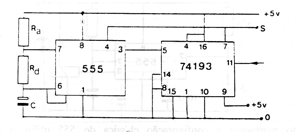 En la figura tenemos el modo de obtener largos temporizaciones para el 555 con la ayuda de un divisor TTL. El circuito ya fue explorado en otros puntos de este sitio debiendo ser alimentado por 5 V. El circuito puede operar como shield.