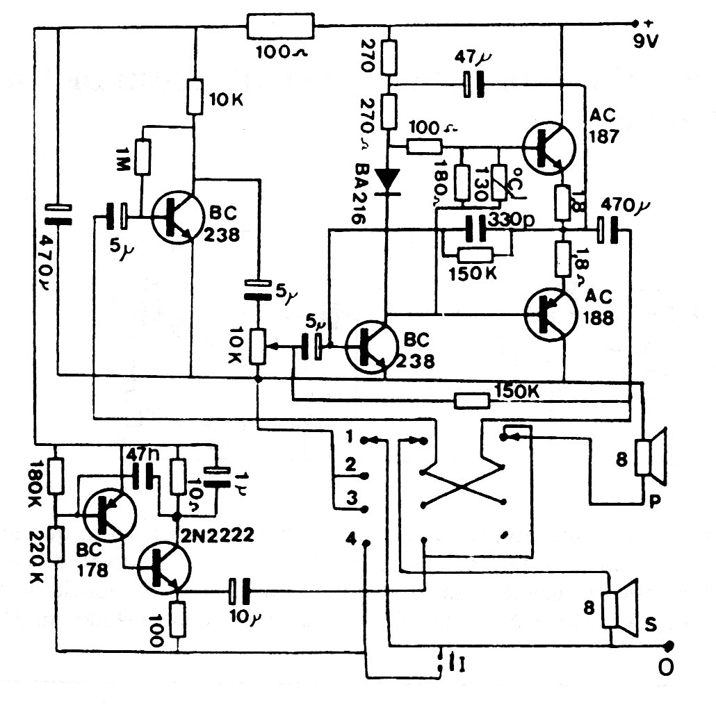 Este circuito es de una documentación de los años 80, por lo tanto utiliza transistores de la época. Sin embargo, se pueden utilizar amplificadores similares con transistores modernos y potencia en el rango de 1 W. El circuito tiene 4 posiciones en la clave siendo una de ellas de llamada que emite una señal generada por el oscilador.