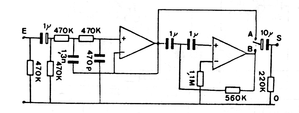 La medida de ruido de fondo de un tocadiscos se realiza con filtro que tiene una frecuencia de corte de 315 Hz, como se muestra en la figura. En el caso, prácticamente cualquier amplificador operacional puede ser utilizado y la fuente de alimentación debe ser simétrica.
