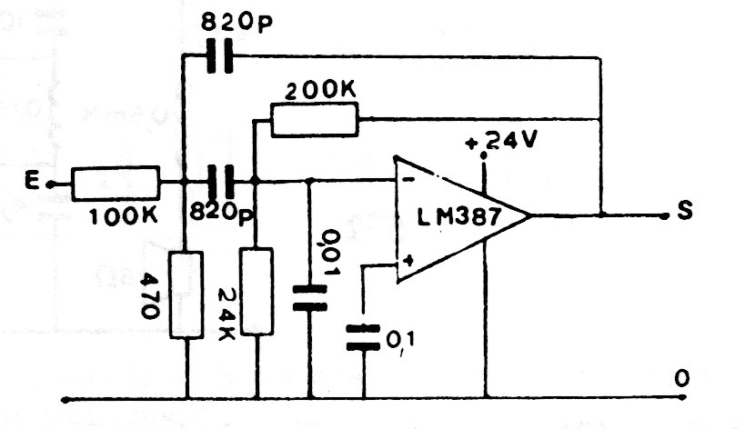 Este circuito también utiliza un integrado poco común en nuestros días. Sin embargo, la configuración se puede experimentar con los operativos equivalentes modernos. Los componentes conducen a una banda pasante de 2 kHz a 20 kHz.