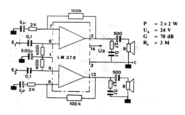 El circuito integrado utilizado en este amplificador de 2 + 2 W no es muy común actualmente. El circuito es de una antigua documentación europea y es alimentado por una tensión de 24 V.