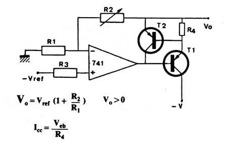 También usando el 741, como el circuito anterior, esta referencia es para tensiones positivas, lo que lleva el uso de transistores PNP. T2 es de uso general y T1 de potencia como el BD136 para corrientes hasta 500 mA.