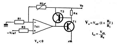 Una etapa transistorizada posibilita la obtención de una referencia de tensión con alta capacidad de corriente. T2 puede ser un NPN de uso general y T2 de potencia. R2 ajusta la tensión.