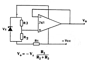 Obtenido en una documentación europea antigua este circuito utiliza el 741 en la configuración si seguidor de tensión, logrando así presentar una baja resistencia de salida. No es necesario utilizar la fuente simétrica y los componentes se calculan mediante la fórmula junto al diagrama.