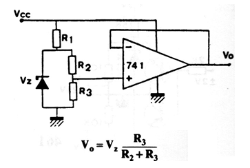 En este circuito tenemos otra referencia de tensión con el amplificador operacional 741, usando la configuración de seguidor de tensión. La tensión es dada por el zener y la fuente no necesita ser simétrica.