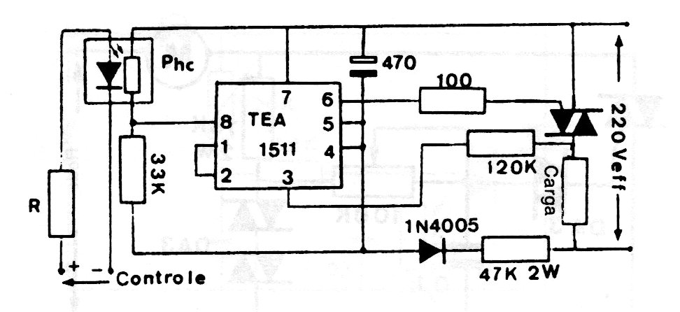 Este circuito, encontrado en una documentación de los años 80, hace uso de un circuito integrado poco común en nuestros días. Sin embargo, sirve como referencia para un escudo con acoplador óptico disparando un triac. El resistor R depende de la lógica de salida del microcontrolador, siendo típicamente de 270 ohms para el Arduino.