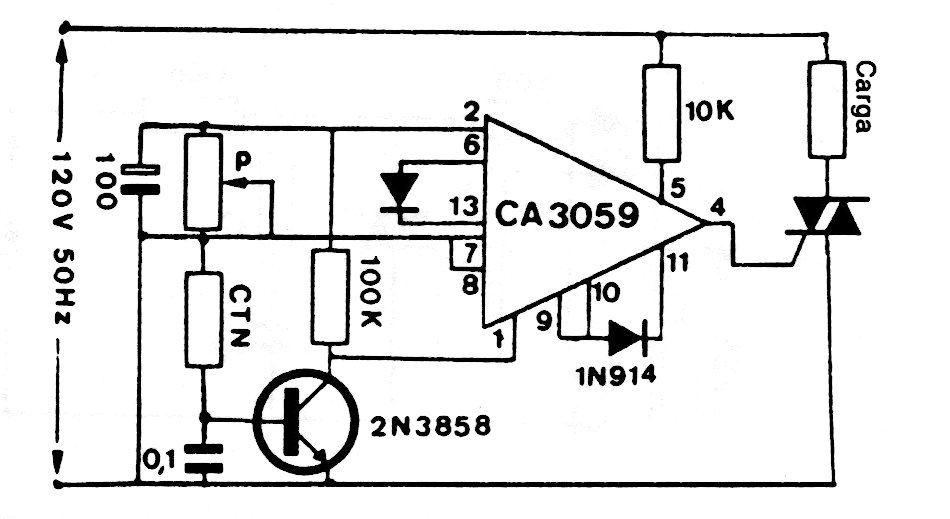 Este control de temperatura con diodo como sensor y disparando un Triac fue encontrado en una documentación de los años 80. El amplificador operacional puede ser sustituido por equivalentes y el transistor puede ser de uso general.