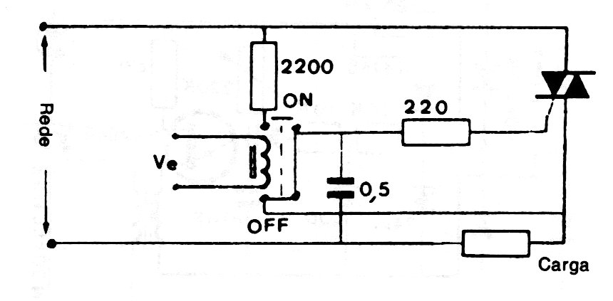 Esta configuración ya explorada en otros circuitos de este sitio permite el control de una carga de potencia en la red de corriente alterna a través de una baja tensión alternada aplicada en Ve. También es posible utilizar un sensor simple que coloque en corto el devanado Ve.