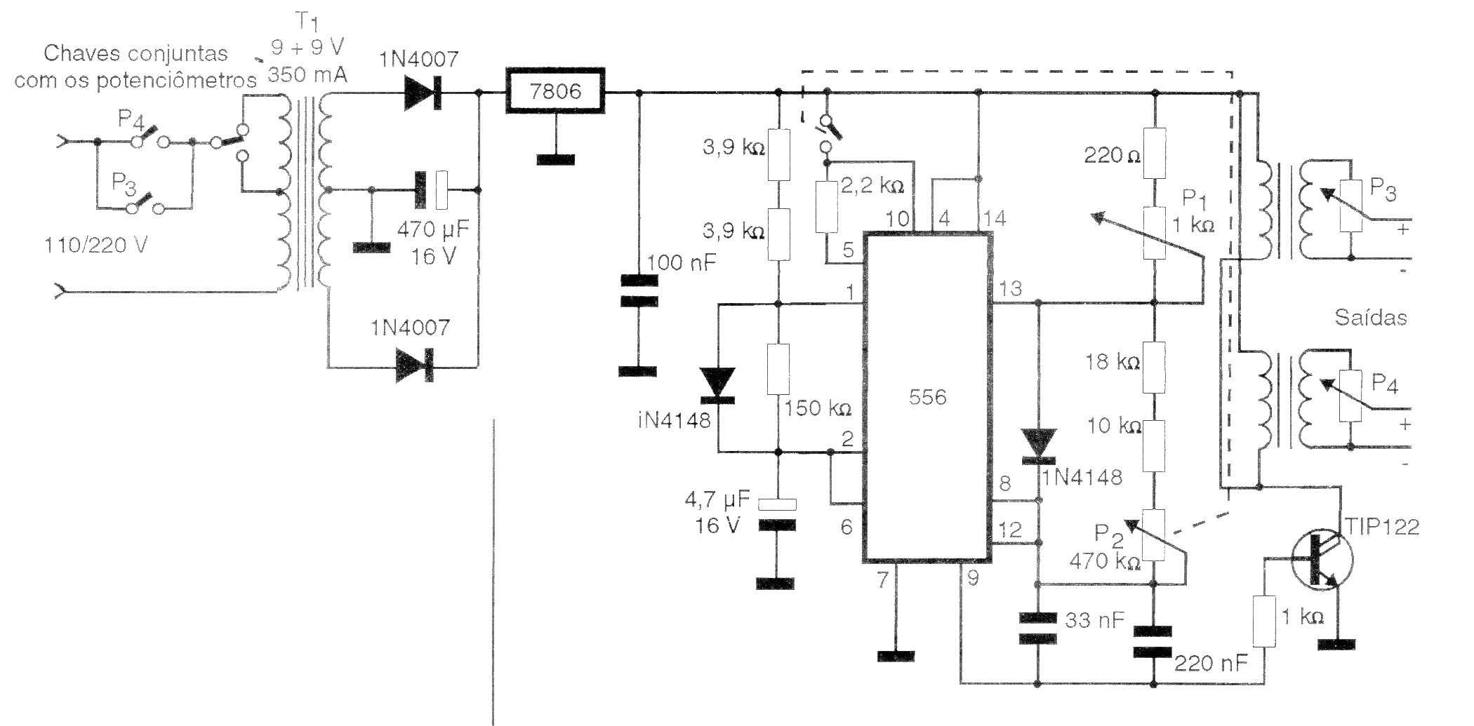 Este circuito fue encontrado en una documentación de 1997. Las señales se ajustan en un 555 doble (556) y los transformadores tienen primarios de 110 V con 6 V de secundario. El circuito integrado regulador de tensión debe estar dotado de un disipador de calor. El autor del proyecto pretendía comercializarlo en la época. Los potenciómetros de salida son de 10k.