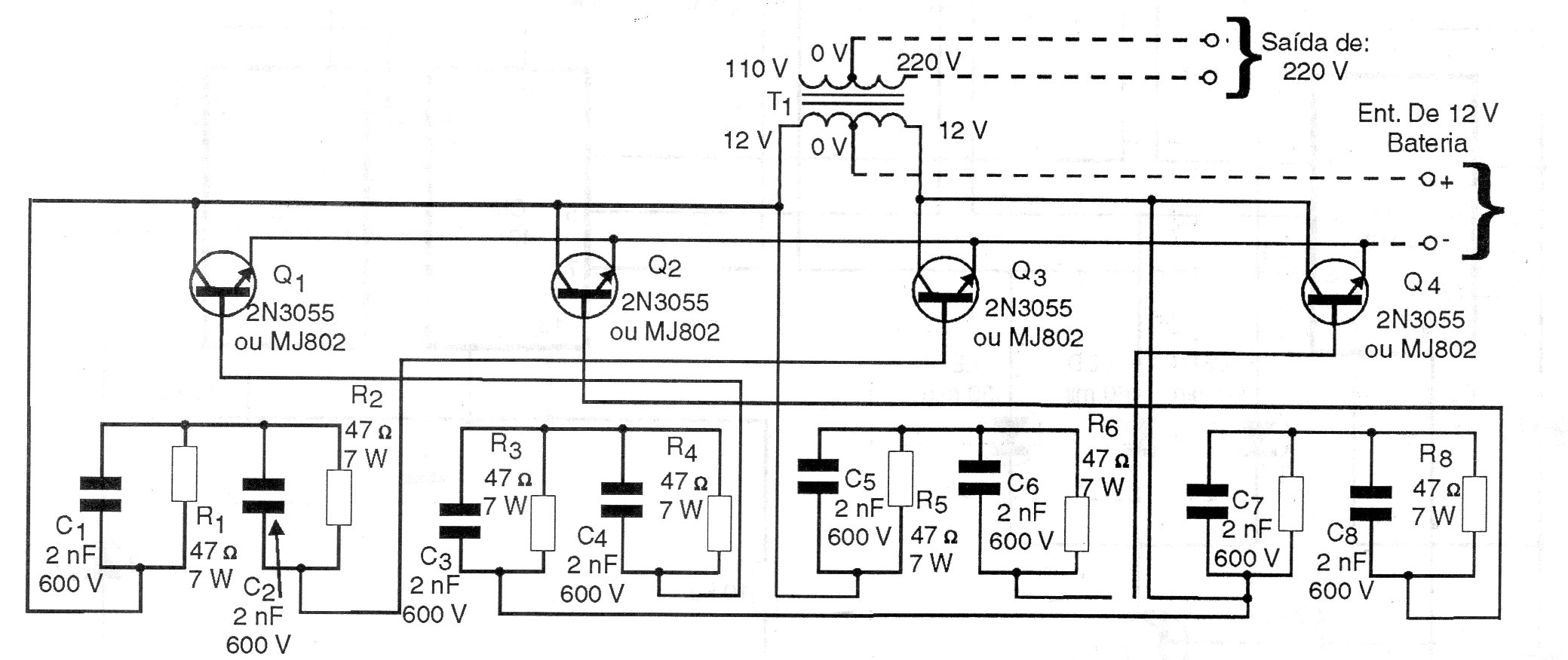 Dependiendo del transformador usado, la potencia de este inversor puede llegar a los 300 W. Se trata de un circuito crítico donde los transistores de potencia deben estar dotados de excelentes disipadores de calor. La tensión de salida depende del transformador. La señal de salida no es sinusoidal y no tiene 60 Hz exactamente. El circuito es de una documentación de 1997.