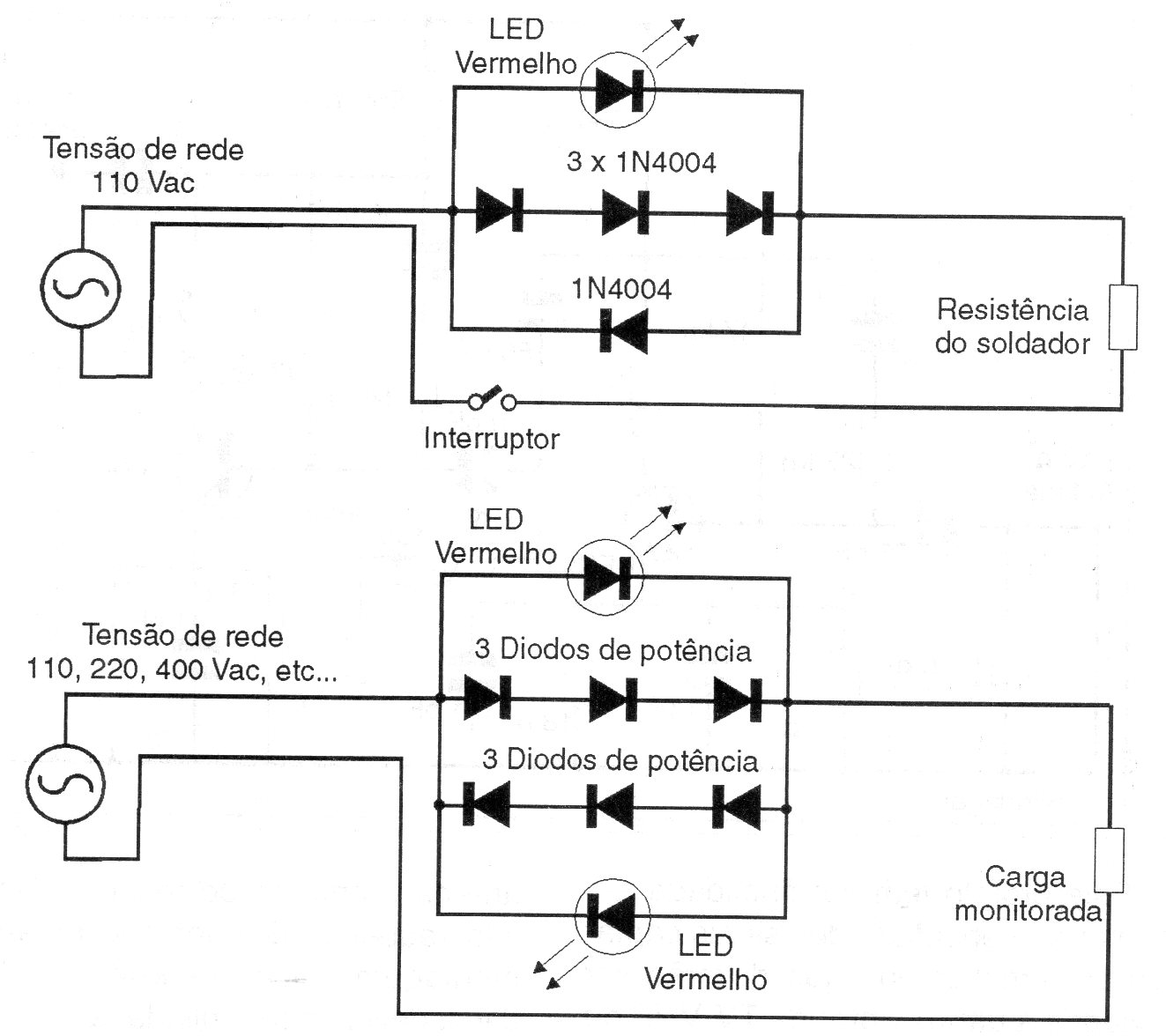 Este simple circuito indicador, en dos versiones, fue encontrado en una documentación de 1997. En el original no hay limitador para los LED. Recomendamos usar una resistencia de 1 k en serie con cada uno.