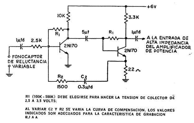 Este circuito se encontró en una documentación de 1958. Se hace uso de transistores de germanio y es adecuado para operar con tocadiscos con cápsulas de reluctancia variable ya que tiene una ecualización RIAA.