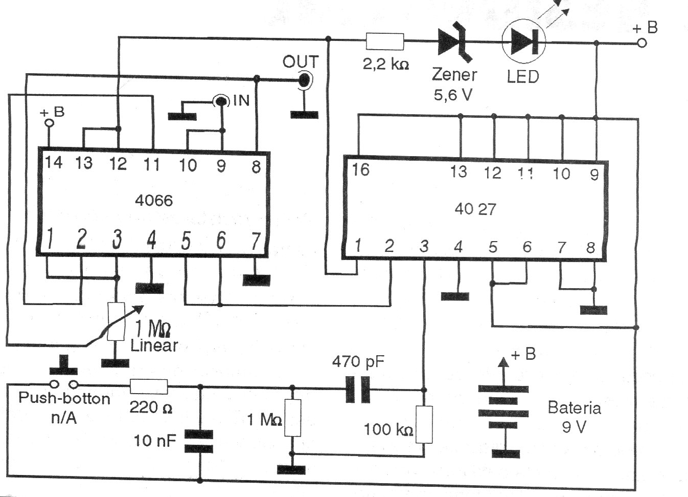 Este circuito fue encontrado en una documentación de 1997, pero utiliza componentes absolutamente comunes en nuestros días. El circuito puede ser alimentado por batería de 9 V, pues su consumo es muy bajo. Los cables de entrada y salida de señales deben ser blindados.