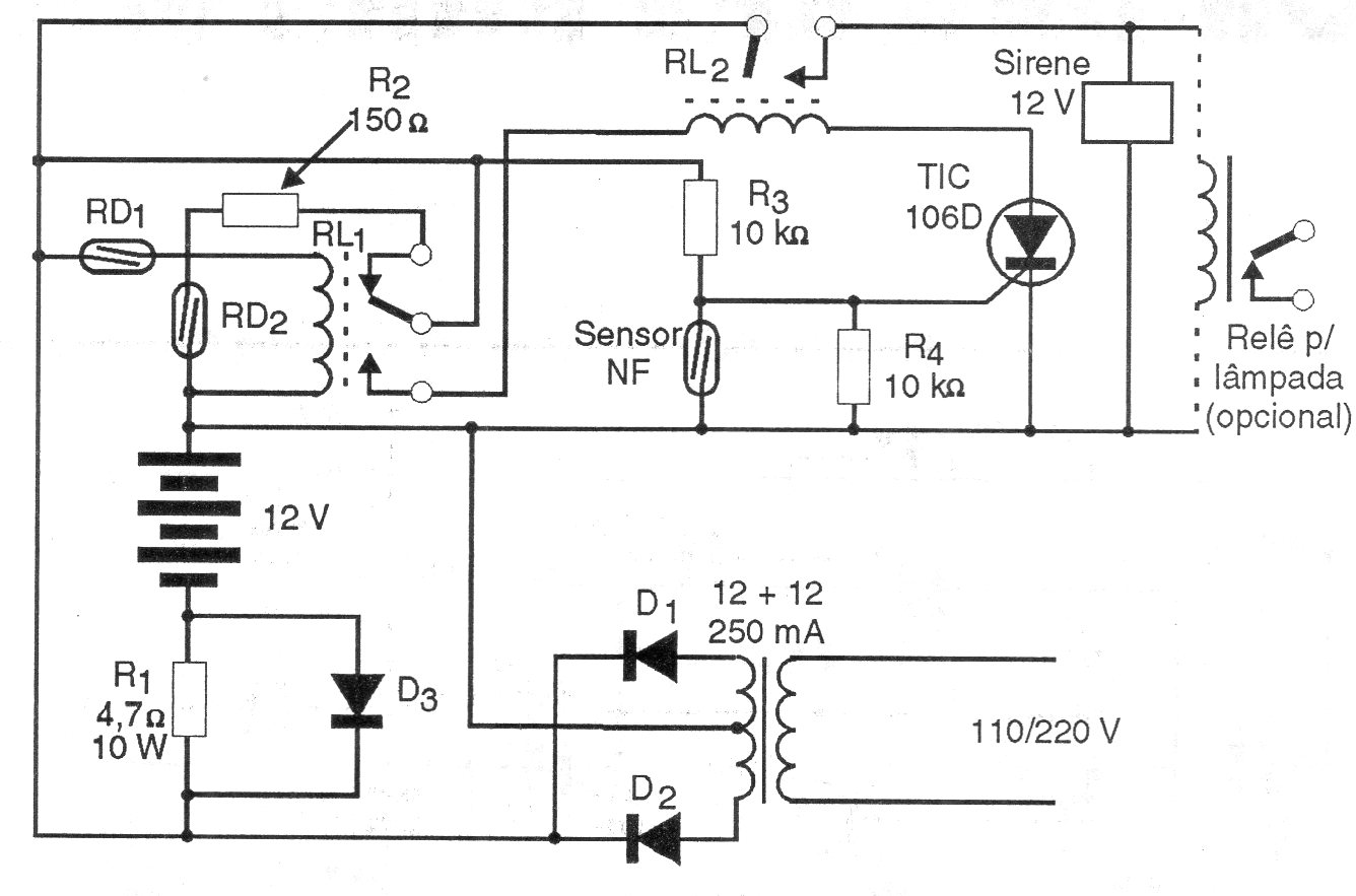 Este circuito fue encontrado en una publicación de 1997, pero utiliza pocos componentes comunes y es muy eficiente. El circuito mantiene una batería en carga que entra en funcionamiento si la energía se corta. El relé de 12 V, según la batería y el accionamiento es de una sirena de 12 V, pudiendo ser d cualquier tipo.