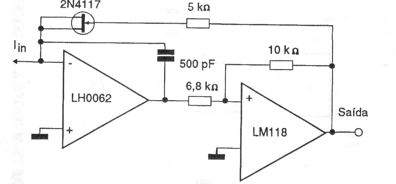 Este circuito fue encontrado en la documentación de National Semiconductor. Su propósito es convertir una corriente de entrada en una señal de hasta 15 MHz. La fuente debe ser simétrica con tensiones entre 5 y 15 V y los componentes usados no son muy comunes en el mercado actualmente. El gráfico muestra el rendimiento del circuito.