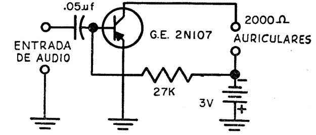 Este es un amplificador con transistor de germanio 2N107. Este fue uno de los primeros transistores fabricados en el mundo, con la documentación el circuito es de 1958. El circuito funciona solamente con los auriculares magnéticos de alta impedancia.