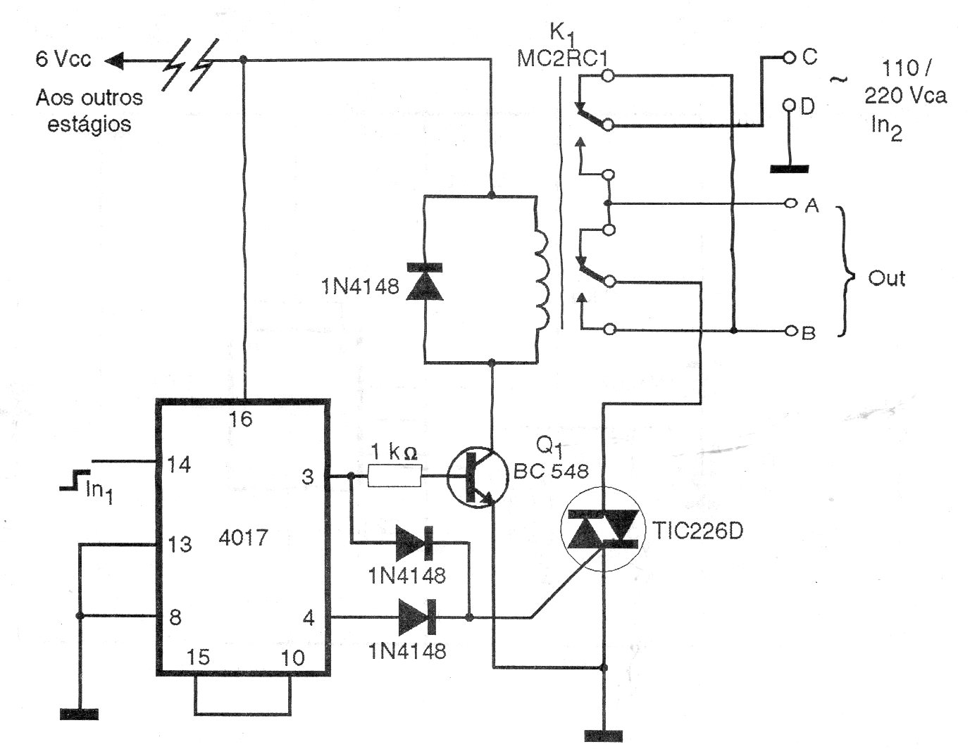 Con este circuito se puede controlar un circuito externo conectando o apagando y también hacer su reversión (si es posible) a través de un relé. El triac debe estar dotado de disipador de calor y el relé es de 6 V o según la alimentación del 4017. El circuito funciona como shield para microcontroladores.
