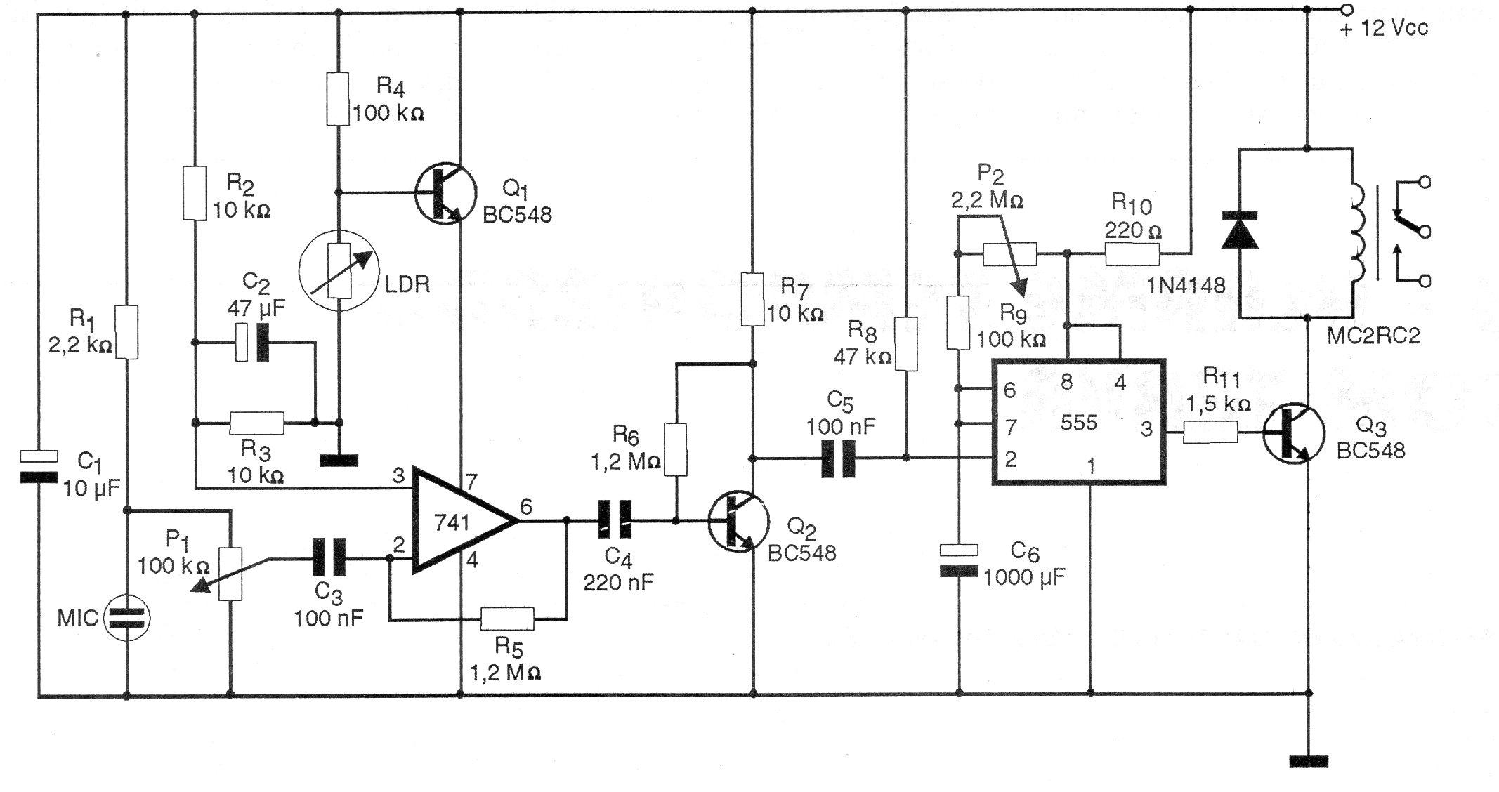 Este circuito está destinado a monitorear un ambiente. Se dispara un relé con un sonido, pero sólo si el lugar está oscuro. El circuito se alimenta con 12 V de acuerdo con el relé, y el ajuste del punto de disparo se realiza en el trimpot de entrada. La temporización se ajusta en el trimpot junto al 555. El circuito es de una documentación de 1997.
