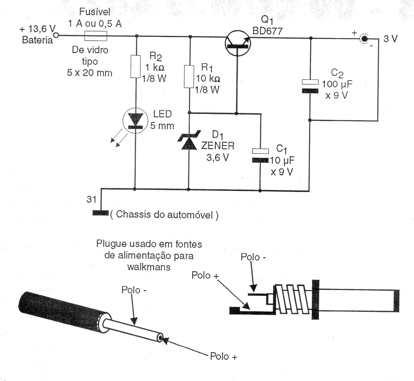 Esta fuente tiene por objeto alimentar aplicaciones de 2 pilas AA o AAA a partir de la batería del coche, utilizando la toma de 13,6 V existente. La corriente máxima es del orden de 500 mA y el transistor debe montarse en un pequeño disipador de calor. El zener determina la tensión de salida.
