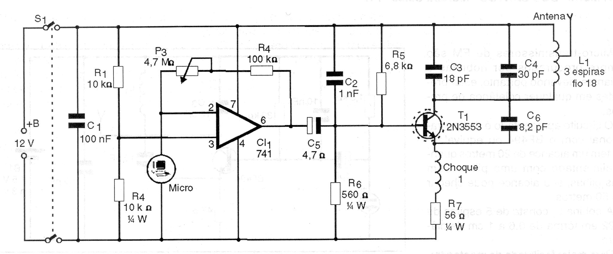 Este transmisor tiene un excelente alcance cuando se utiliza una antena externa (respetando las restricciones legales). El circuito debe ser alimentado por batería o fuente con excelente filtrado. El transistor de potencia debe montarse en un disipador de calor. La modulación viene de un micrófono de electreto y la modulación ajustada en P2. C4 puede ser cambiado por un trimmer para ajustar la frecuencia. El choque 1 consiste en 40 espiras de hilo 32 en un resistor de 100k x ½ W.