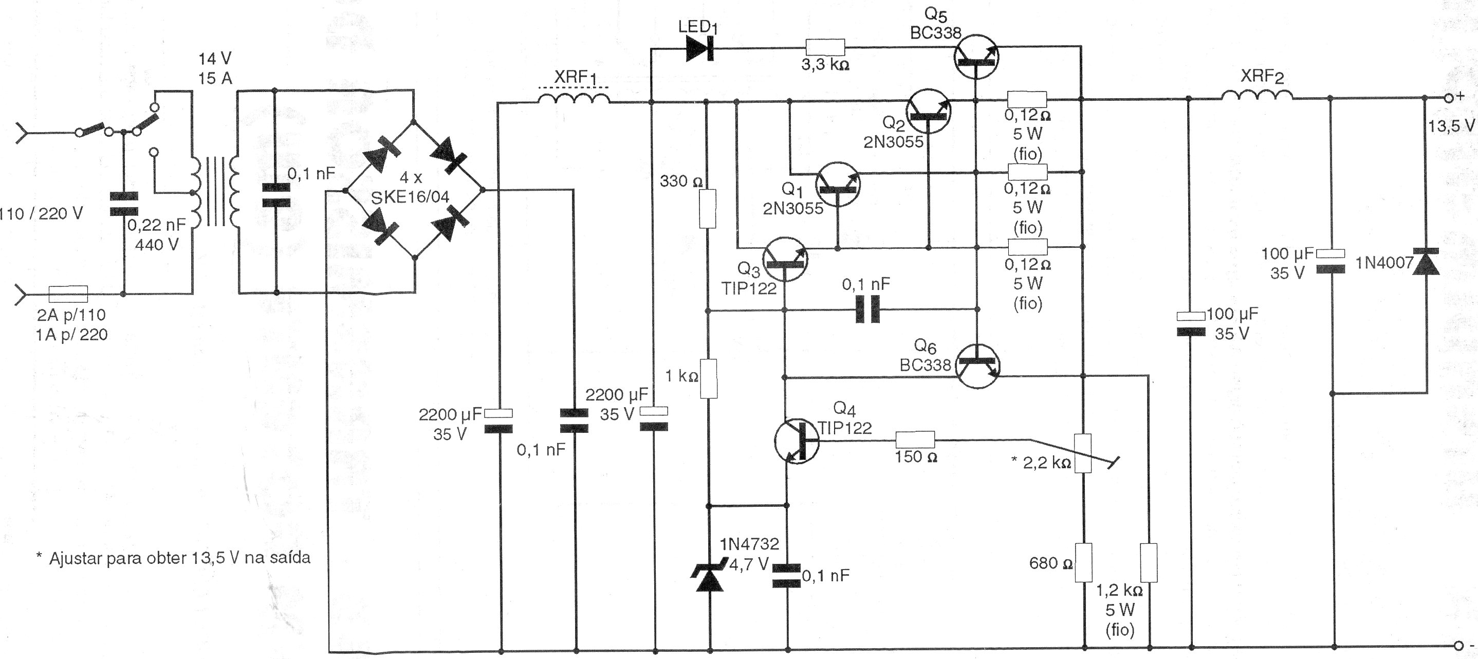 Encontramos este circuito en una documentación de 1997. Se trata de una fuente indicada para la alimentación de equipos de uso en el coche con consumo hasta 15 A tales como amplificadores, transceptores, CD-players, etc. Los transistores de potencia deben estar dotados de buenos disipadores de calor y XRF1 tiene 10 espiras de hilo 14 en un núcleo de ferrita mientras que XRF2 tiene 5 espiras del mismo hilo en forma sin núcleo.
