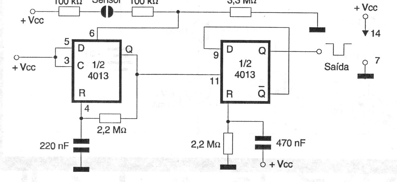 Este circuito consiste en una llave biestable de toque con el conocido flip-flop doble CMOS 4013. El circuito puede ser alimentado por tensiones de 3 a 13 V y funciona como un excelente escudo de control para microcontroladores. El circuito y el microcontrolador nunca deben ser alimentados por fuente sin transformador.
