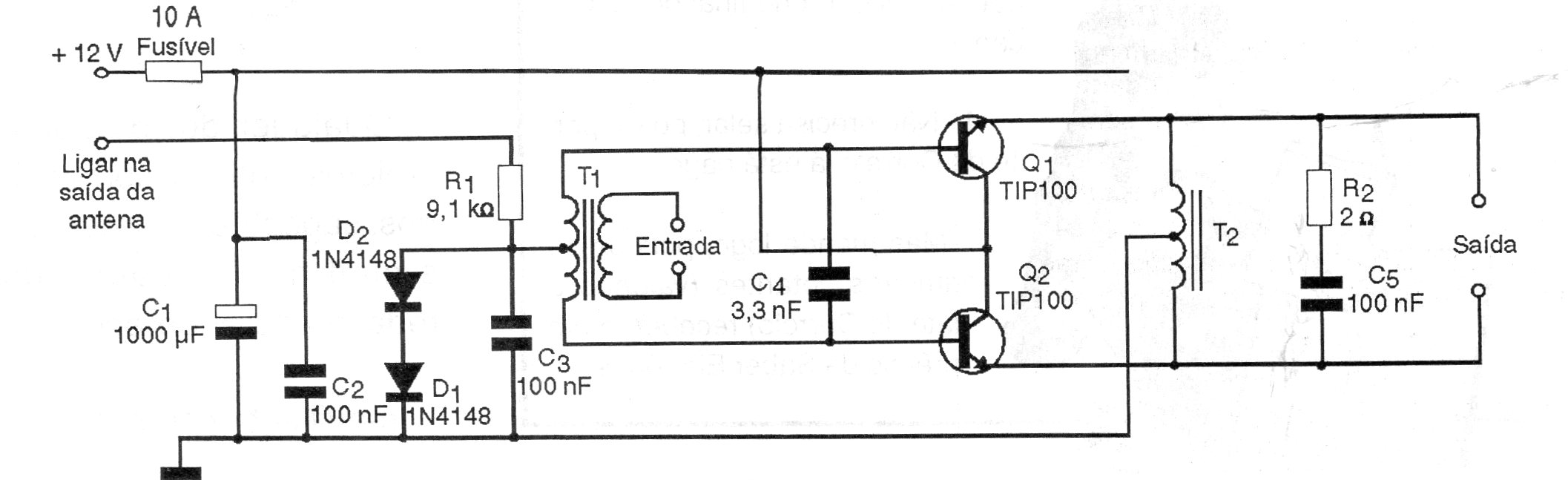 Este circuito se destina al refuerzo de radios antiguos de coches, habiendo sido encontrado en 1997. En aquella época los radios y amplificadores (tocadiscos) tenían pocos vatios y una solución era el módulo amplificador como el indicado. El circuito utiliza dos transformadores. T1 tiene primario de 8 ohmios y secundario de 600 ohmios a 3k ohms. Un pequeño transformador de 110/6 o 9 V con 200 mA sirve. T2 se enrolla en un carrete de un pequeño transformador de alimentación que constan de 100 + 100 espiras de hilo 21.