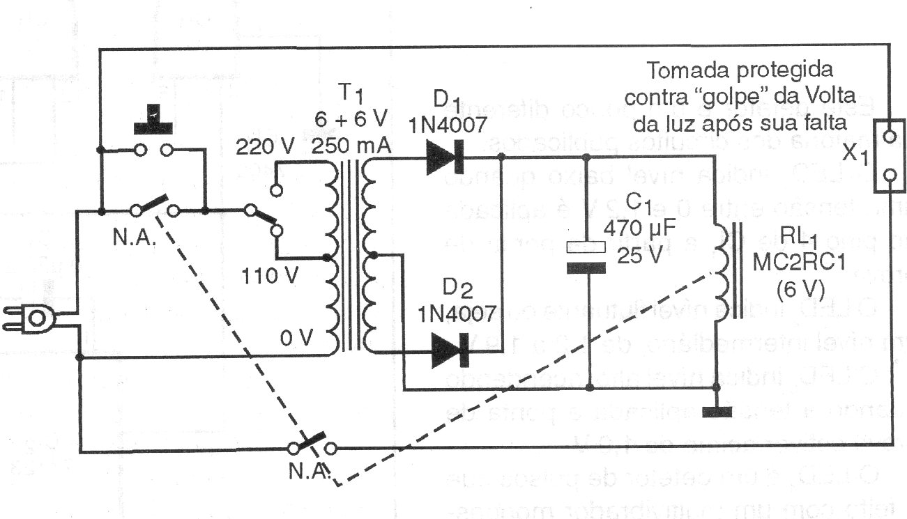 En caso de corte de energía, este aparato impide su restablecimiento en los aparatos cuando vuelva, evitando así transitorios y surtos peligrosos. El reajuste de los aparatos se realiza mediante un interruptor de presión. El relé es de 6 V, según el transformador.