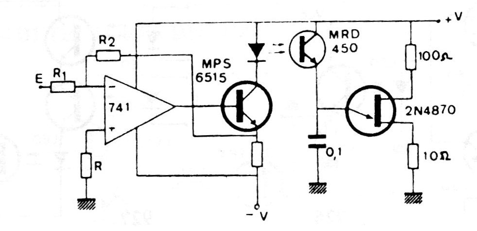 Este circuito con aislamiento óptico puede ser utilizado como shield mediante modificaciones. La salida de las señales se puede hacer en cualquiera de las bases del transistor unijunción y la tensión de alimentación depende de la aplicación. Se pueden utilizar amplificadores operacionales equivalentes. El transistor unijuntura puede ser el 2N2646.