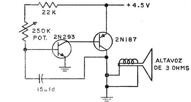Esta configuración conocida que se utiliza en muchos de nuestros proyectos fue encontrado en una documentación de 1958. Los transistores de germanio son del tiempo, pero nada impide que se utilizan transistores equivalentes modernos. El potenciómetro puede ser de 220 o 470 k Ω. El circuito funciona como un metrónomo.