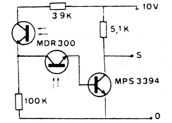 Esta puerta E o AND utiliza foto-transistores comunes y el transistor admite equivalentes. El circuito es de una documentación de los años 90. La alimentación puede ser cambiada para que el circuito opere como shield y con lógica TTL.