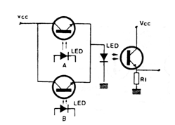 Este circuito consiste en una configuración básica de una puerta O (OR) óptico usando foto-transistores y un acoplador óptico. El circuito puede adaptarse para funcionar como escudo. Foto-Transistores comunes se pueden utilizar y la alimentación depende de la aplicación.