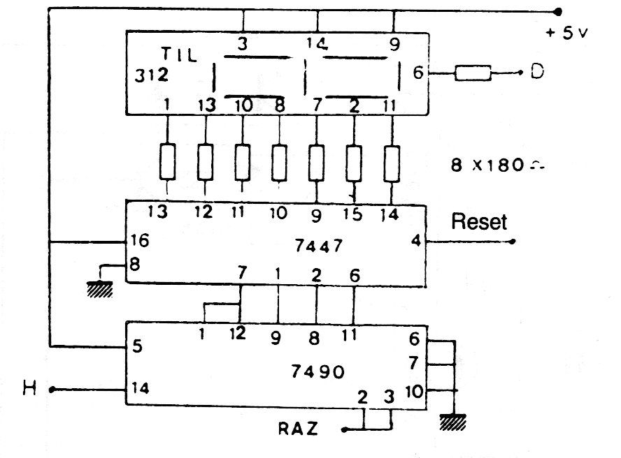 Esta es una configuración tradicional ya explorada en este sitio de otras formas. Esta fue obtenida en una documentación europea de los años 80, debiendo ser alimentada por una tensión de 5 V. RAZ significa Retorno a cero o Reset.