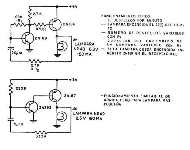 Los dos circuitos mostrados han sido encontrados en documentos de 1958. Estos circuitos tienen un cargas incandescentes comunes pero se pueden utilizar en con los LEDs tiendo e serie resistores de 47 Ω a 470 Ω, según la potencia deseada. Los transistores originales son germanio, pero se pueden utilizar equivalentes de silicio modernos.