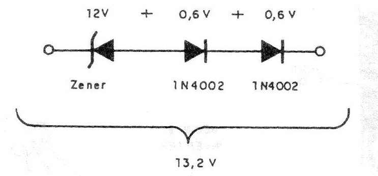 La tensión de 13,2 V está más cerca de lo que realmente encontramos en una batería de coche que 12 V. Así, un zener de 13,2 V puede ser utilizado en una fuente que alimente un equipo de uso automotriz de forma más apropiada. Un zener de este tipo puede ser improvisado con un zener de 12 V y dos diodos comunes, como muestra la figura. Usando el mismo razonamiento podemos aumentar en pasos de 0,6 V, la tensión de cualquier zener.