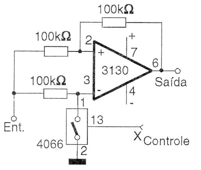 El interesante circuito mostrado en la figura, puede tener su ganancia controlada digitalmente y presentar dos valores. Cuando la entrada de control X, está en el nivel alto (+5 V), la ganancia de este amplificador es -1 (seguidor inversor). Cuando la entrada de control X se lleva a una tensión de -5 V, la ganancia pasa a ser +1 (seguidor no inversor). Observe que la fuente para el circuito integrado CMOS 4066 (cuatro llaves analógicas digitales), debe ser simétrica con 5-0-5 V, pues su operación se realiza en el modo analógico. El CA3140 es un amplificador operacional con transistores de efecto de campo en la entrada, pudiendo utilizarse tipos equivalentes.