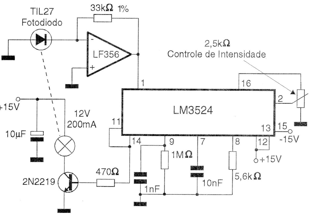 El propósito original del circuito de la figura, sugerido por National Semiconductor, es mantener constante el brillo de una lámpara en función del grado de iluminación de un fotodiodo en un proceso de fabricación de películas fotográficas. Por supuesto, el circuito se puede utilizar con otros propósitos, como por ejemplo la regulación del brillo de los ambientes o el control de la transparencia de las sustancias químicas. En este circuito, la intensidad de luz captada por el fotodiodo es amplificada por un operacional, realimentando el circuito integrado de control LM3524. La señal de realimentación se utiliza para excitar un transistor de pequeña potencia que tiene por carga una pequeña lámpara. La lámpara y que proporciona la señal de excitación para el "bucle" de control que tiene el fotodiodo. Observe la necesidad de utilizar la fuente simétrica para este circuito.