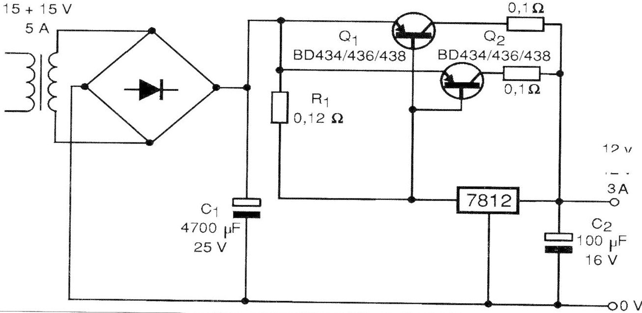 El circuito ilustrado en la figura puede suministrar corrientes de hasta 3 A bajo tensiones de 12 V con excelente regulación dada por el circuito integrado 7812. Tanto el circuito integrado como el transistor necesitan ser montados en radiadores de calor. Los diodos deben ser para 50 V x 3 A o más, y el resistor R1 es de hilo. Se pueden utilizar los equivalentes de los transistores indicados.
