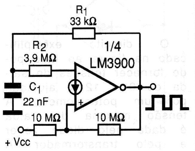 Uno de los cuatro amplificadores operacionales de Norton del LM3900 se utiliza en este oscilador, que tiene un ciclo activo del 50%. La frecuencia es del orden de 1 kHz y puede ser cambiada con el cambio de C1 o aún de R1 y R2. La fuente de alimentación debe ser simétrica y la señal de salida tiene la forma de onda rectangular.