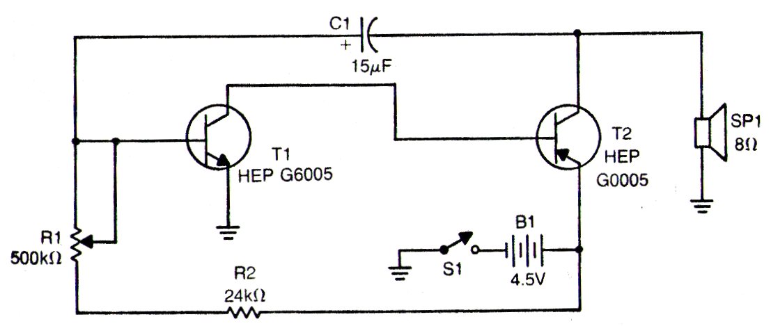 Esta configuración es bastante tradicional, apareciendo en varias publicaciones de todo el mundo. Esta es una publicación americana de 1978 con transistores de Raytheon que ya no existen. Podemos utilizar para T1 el BC548 y para T2 el BC558. La alimentación se puede hacer con tensiones de 3 a 6 V y R1 puede ser un potenciómetro actual de 470 k. C1 determina el sonido y se puede reducir a un sonido más agudo. Se pueden utilizar valores entre 47 nF a 15 uF.