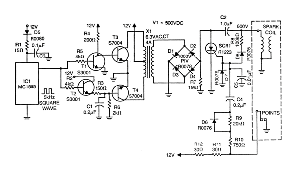 El componente crítico de este circuito es el transformador. T1 y T2 pueden ser BD135 y T3 / T4 pueden ser 2N3055. El circuito integrado es el 555. El SCR puede ser el TIC226. El inversor utilizado trabaja con una tensión de 500 V. En el diseño, cambie la configuración del 555 a la convencional de astable con los componentes recomendados.