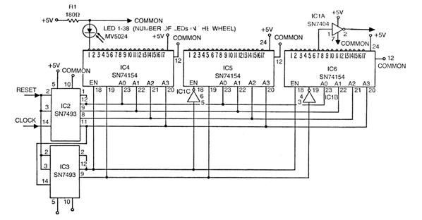 Este circuito TTL es de una publicación americana de 1978, pero puede ser montado con facilidad, pues los TTL usados son comunes. El circuito debe ser alimentado con 5 V y la señal de reloj que hace el sorteo puede ser generada por un 555 asequible disparable. En el sitio existen varias configuraciones para este propósito (véase el circuito CIR4256, por ejemplo).